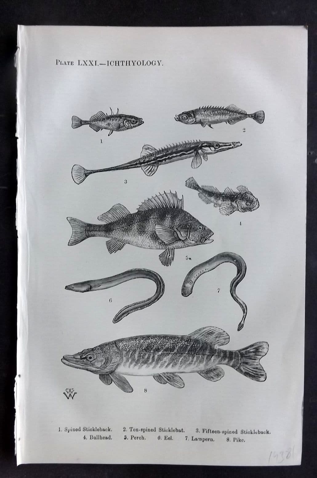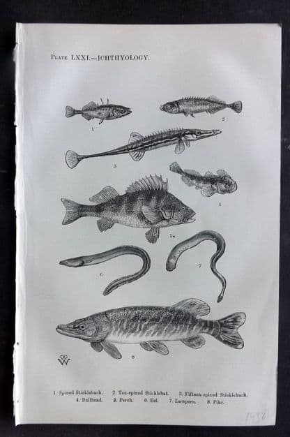 Beeton 1870 Print. Stickleback, Bullhead, Perch, Eel, Lampern, Pike Fish 71