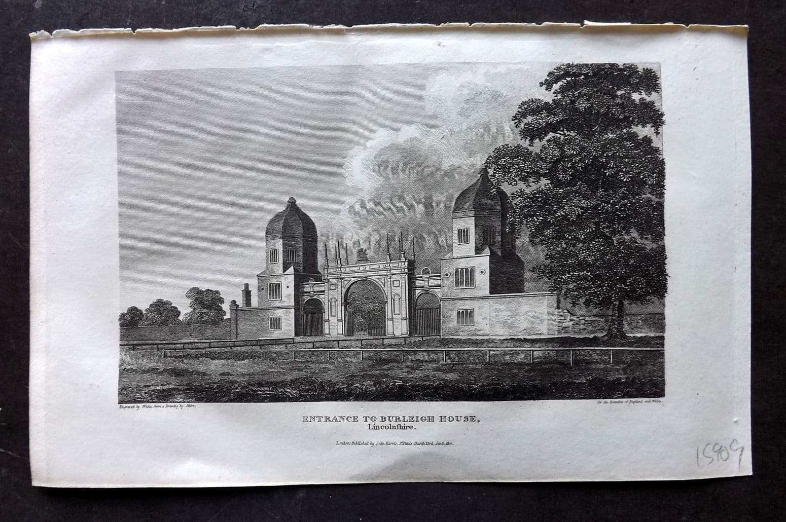 Britton C1810 Antique Print. Entrance to Burleigh House, Lincolnshire