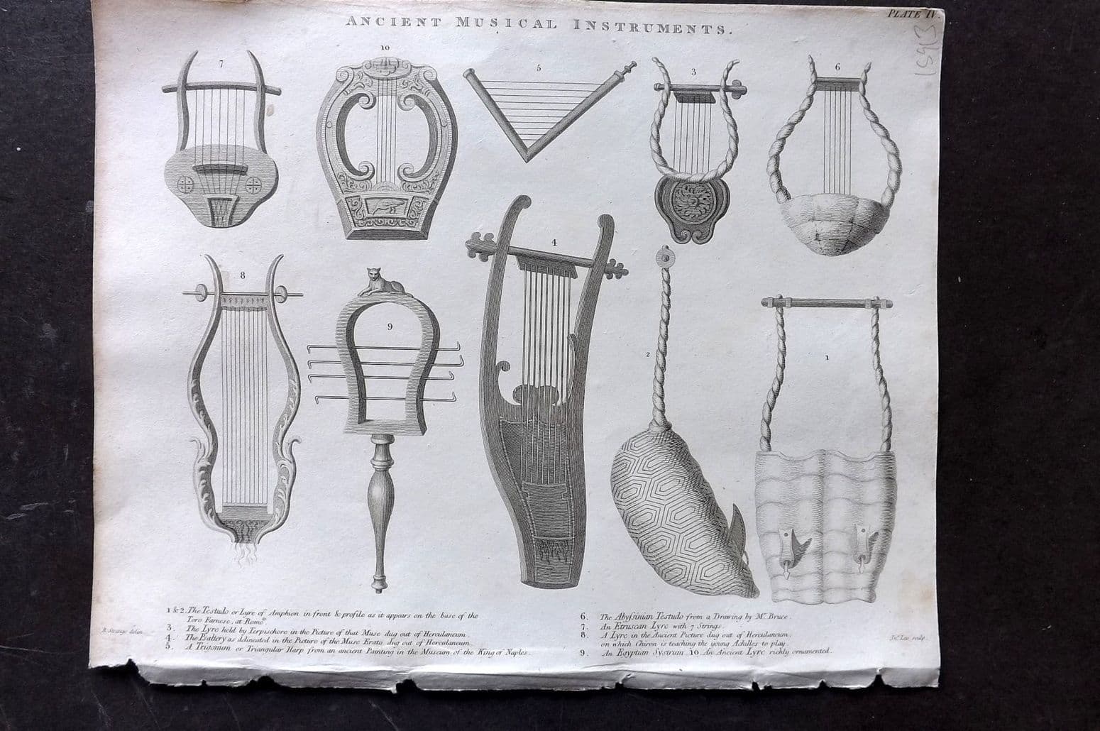 Rees 1820 Antique Music Print. Lyres, Triangular Harp, Egyptian Systrum 04